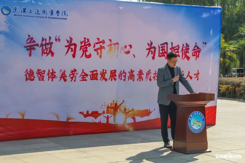 党委书记杨震对青年学子提出两点要求:一是为党守初心。杨震希望同学们要恪守初心、坚定信念、沉淀自我,以任尔东西南北风的定力,在前进路上披荆斩棘、乘风破浪;二是为国担使命。杨震希望同学们做担负使命、扛起责任的先行者、实干者,牢固树立主人翁意识,心怀“国之大者”,不断提高业务本领,践行社会责任,用奋斗擦亮青春底色,以实干担当时代重任,在实现民族复兴的赛道上奋勇争先,砥砺前行,在更多大国制造上镌刻“武交院印记”,在更广袤的祖国大地上书写“武交院故事”。