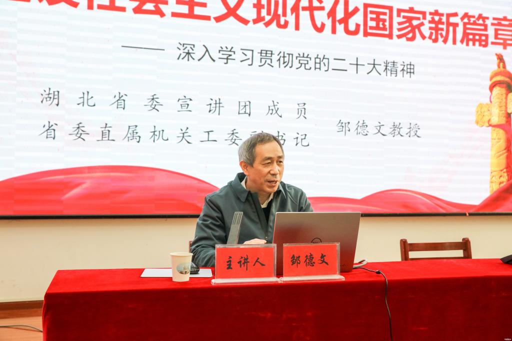 中共湖北省委直属机关工委副书记,湖北省委宣讲团成员邹德文教授以“奋力谱写全面建设社会主义现代化国家新篇章”为主题,围绕党的二十大的主题和主要成果、过去五年的工作和新时代十年的伟大变革、开辟马克思主义中国化时代化新境界、以中国式现代化推进民族复兴的使命任务、全面建设社会主义现代化国家的重大部署、以伟大自我革命引领伟大社会革命、为全面建设社会主义现代化国家团结奋斗七个方面,对党的二十大提出的重要思想、重要观点、重大战略、重大举措进行全面系统、深入浅出的宣讲解读。邹德文强调,中国式现代化不是等来的、要来的,而是干出来的,斗争来的,要牢记空谈误国、实干兴邦,坚定信心、同心同德,埋头苦干、奋勇前进,为全面建设社会主义现代化国家、全面推进中华民族伟大复兴而团结奋斗。